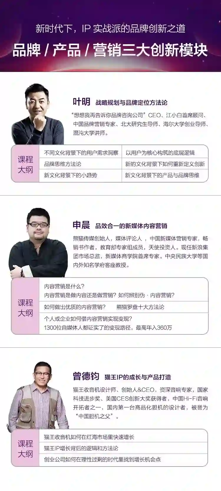 作为在新媒体领域投身多年的专家,申晨拥有丰富的新媒体营销实战经验与相关资源,对于如何将内容和IP进行有机结合,打造影响力,有着自己极富创意的方法论。