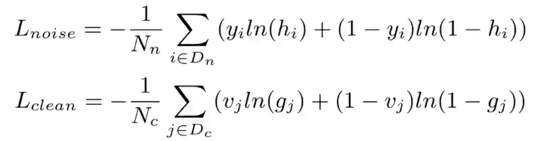 如图所示,我们以多任务学习的方式进行弱监督图像分类,同时训练两个分类器g和h分别拟合干净集合中的干净标签和噪声集合中的噪声标签。主干网络CNN(Backbone CNN)用于学习共享特征。净化网络(clean net)用于学习从特征空间到干净标签空间的映射,残差网络(residual net)用于学习从特征空间到标签残差(干净标签和噪声标签之间)的映射。