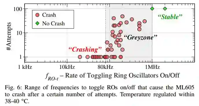 以ML605开发板作为实例,作者在片上布设了18720个环形振荡器,大约只占用了12%的片上资源。使能信号的频率fRO-t从20kHz到2MHz。实验发现,在高于1MHz时,片上电压压降不足以引起欠压保护;在80kHz到1MHz的范围内,系统崩溃会随机的发生;而在频率小于80kHz时,系统崩溃几乎必然发生。