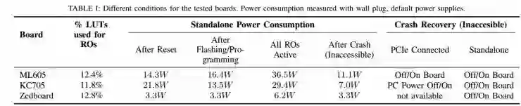 测试中,三种开发板都在一定条件下发生了欠压保护导致的系统崩溃。ML605和KC705在欠压保护后均无法自动恢复。Zedboard则会随机出现三种不同的系统故障:一是和前两块开发板一样出现无法自动复位的欠压保护;一种是芯片自动重置,片上所有的设置,包括两个ARM核的状态也被重置;第三种状况类似重置,但是作者在试图重新配置芯片时发生软件故障,之后系统便进入第一种无法自动恢复的欠压保护模式。可见,不论出现何种故障,都需要手动重置电源才能恢复系统。