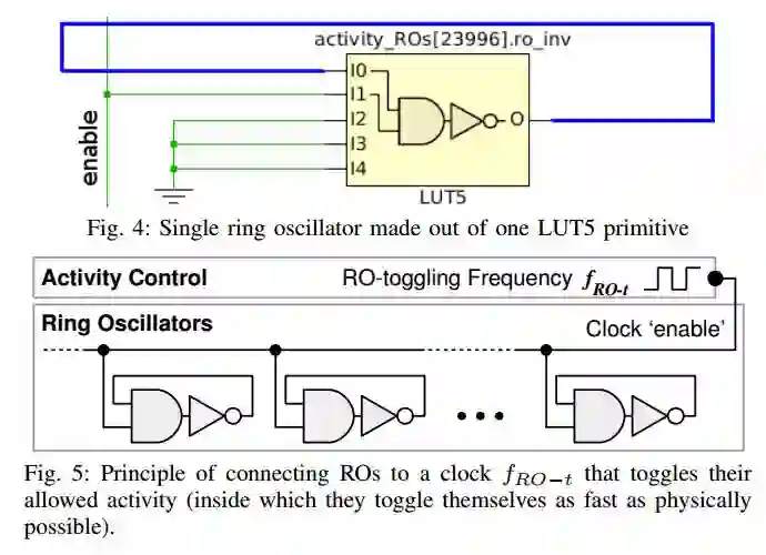 为了达到瞬间改变FPGA负载的效果,作者将一个逻辑单元的输出经过一个非门连回到输出端。如下图所示,这样的电路构成了一个正反馈的环形振荡器(Ring Oscillator)。环形振荡器里的CMOS开关管会以极快的速度翻转,消耗大量电流。大量逻辑单元都被设置成这样的环形振荡器,并且通过一个使能信号控制所有振荡器,就能瞬间改变FPGA的电流负载。通过控制使能信号的开关频率fRO-t,可以模拟不同的负载变化来观察其对FPGA的影响。