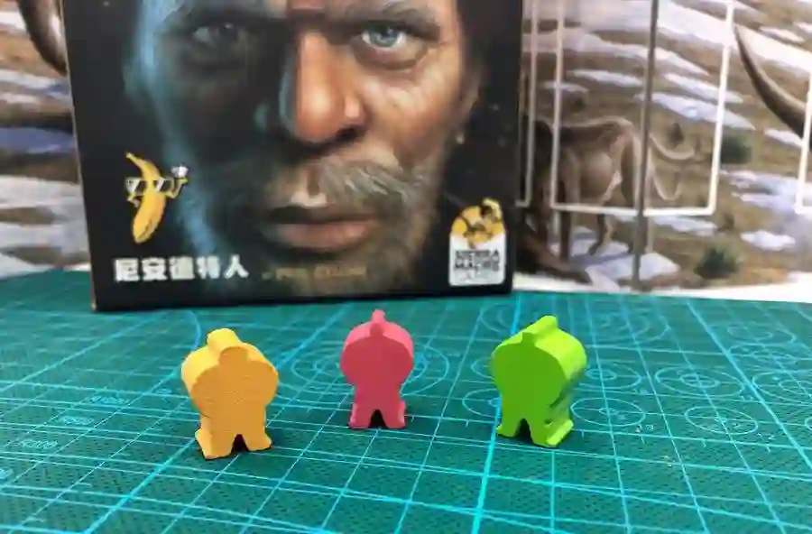 比如三种古人类里,尼安德特人身体比较强壮而且脑容量也大,他的米宝(Meeple,桌游里的小人模型)体型和脑袋就明显大了一圈。