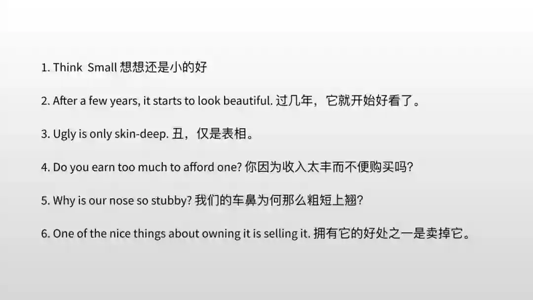 「想想还是小的好」说的是什么?你们美国人都觉得甲壳虫小是吧,那我讲下小的好处。外形可爱啊,省油啊,好停车啊。