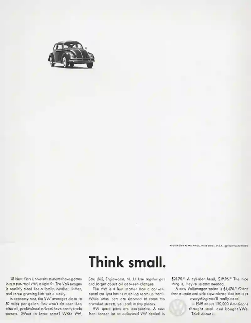 背景是什么呢?当时甲壳虫要进入美国市场。但美国和中国一样是吧,什么都喜欢大,大车大房子什么的。甲壳虫不仅小,还丑。伯恩巴克当时带领团队走进工厂走访工程师采访二手车老板,把甲壳虫的所有卖点都记了下来。然后这套广告出来后,大家发现广告的有趣和销售力不是矛盾的。