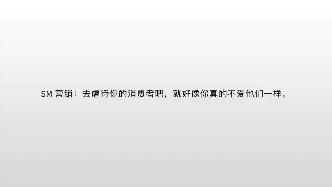 当然为了效果,我起了个比较吸引人的题目,叫 SM 营销。道理说的是什么呢?说的就是品牌不应该有讨好消费者的心,至少看上去不应该。你一旦开始考虑观众能否喜欢你的东西你就开始分心了。