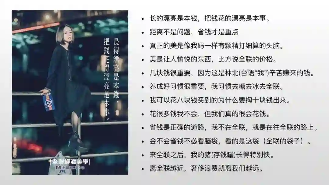 所以全联的广告大家看,他换着花样的去说的就这么一件事,我为什么能帮你省钱,这就是全联给消费者者找的犯罪动机,我千方百计为你省钱,你来不来,这就是我们需要为消费者寻找的「犯罪动机」,对消费者而言,花钱可以,你理由要好。