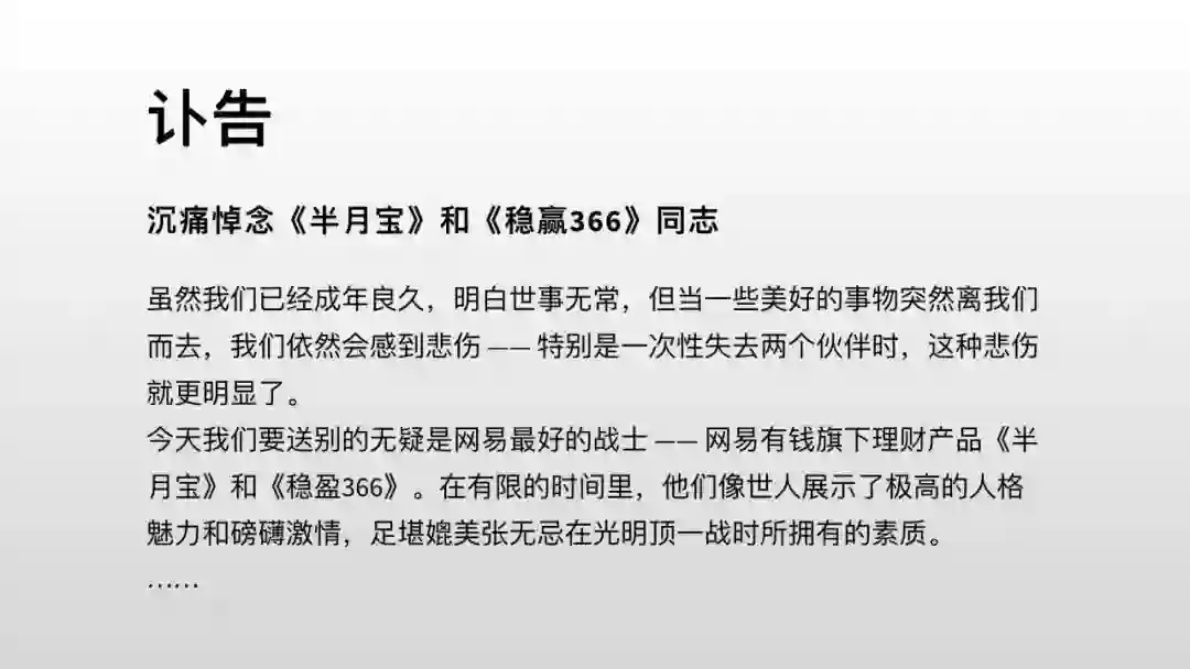 大家从来没看过讣告,一看这个标题,吓坏了,赶紧往下看,看下去就知道是个玩笑了么,最终也就买买买。这个公告后,两款产品在那一天卖了 6000 多万,是网易有钱的一个高点。