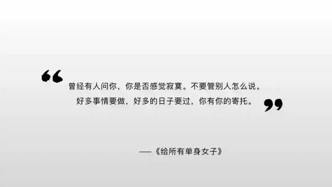 但很多人不觉得,他觉得你是一个单身女子,你就一定会寂寞。这不一定啊,很多人只是孤独,但不寂寞。好多的事要做,好多的日子要过,你有你的寄托,做点啥不好啊是吧,去喝咖啡,去撸猫,去健身,为什么单身女子就一定会寂寞?