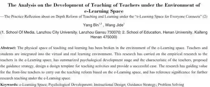 随着我国三通两平台建设的不断推进,各省市区的网络学习空间应运而生,其功能越来越多、操作越来越便利,在“网络学习空间人人通”的建设目标下,为变革教师的“教”和学生的“学”提供了优良的环境支持。但是,硬件建设只是人人通的预备阶段,真正意义上的人人通是教师在教与学中对网络学习空间的充分应用,是学生利用网络学习空间开展跨时空学习,并与传统教学的深度融合。其中,教师教学的变革是决定网络学习空间存在意义的核心要素之一,因此,探讨网络学习空间环境下开展教学活动时,教师的发展状况,包括心理发展等,有利于深化“网络学习空间人人通”的建设内涵,更能有效发挥其促进教学变革。本研究利用L市的网络学习空间开展了为期2年的网络学习空间教学应用实证研究,是“网络学习空间人人通”的教育实践尝试,从教学一线来探究网络学习空间环境下师生在教学中的发展,为“网络学习空间人人通”在教学一线的落实积累了成功的教学经验和教学实践案例,对于改进教师网络环境下开展教学改革的方式、方法有重要的实践指导意义,以期为能为更多教师顺利开展基于网络学习空间教学提供借鉴与理论支撑。