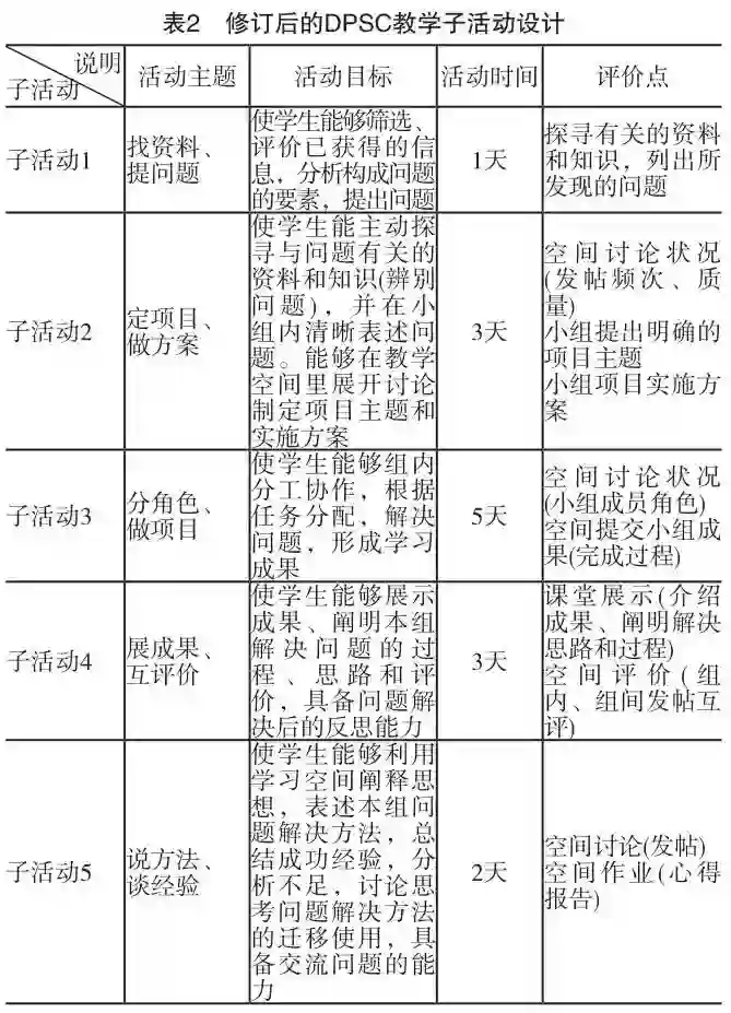 为了帮助教师尽快熟悉应用网络学习空间开展教育教学活动的方法,笔者设计了网络学习空间DPSC教学活动设计模板为教师由传统教学转向基于网络的教学架起一座桥梁。两轮迭代研究中根据行动研究的反馈意见和课堂观察以及网络学习空间的教学活动分析,对教学活动设计模板做了两次修订,最新修订的模板突出了教师设计活动和学生参与活动的要素,考虑了新媒体、新技术对于网络学习空间的支持作用,修订后的网络学习空间DPSC教学活动设计模板更加适合教师分步骤设计培养学生问题解决子能力,为教师开展基于学科的网络学习空间教学设计提供了设计支架。