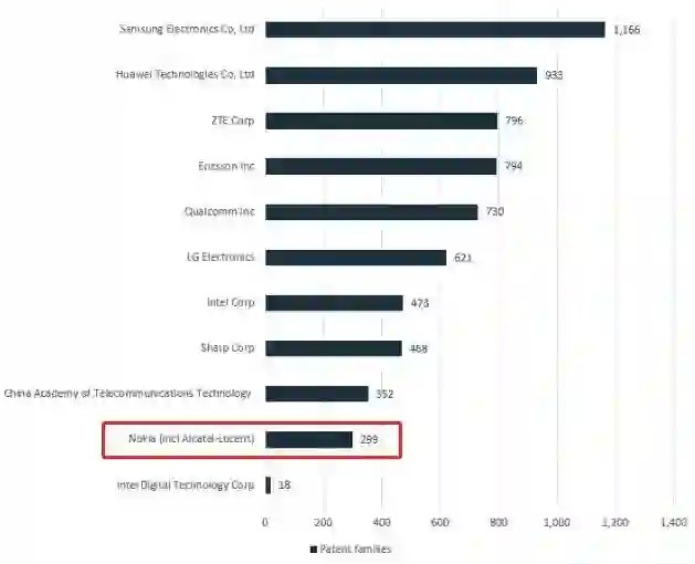 从更为关键的已申报SEP的顶级专利所有者一项可以看出,随着美国和韩国相继商用5G,与去年12月底的那份报告相比,各家厂商的SEP数量和排位发生不小变化。中国企业的排位持续上升,华为1554项、中兴1208项、大唐545项分列第一、第五、第九位,OPPO拥有207项,跌出前十,位列第十一。诺基亚则彻底翻身,从第十名一跃至第二名,拥有的SEP也从299项增长为1427。