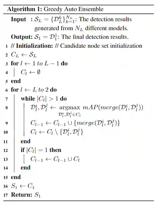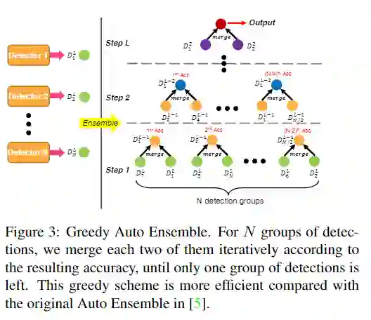 设计了一个贪婪的自动融合方案,它会根据其检测精度自动合并多组检测结果,如图3所示。注意到一组检测代表了从唯一检测器框架或特定检测器生成的检测结果。借鉴了《1st Place Solutions for OpenImage2019 - Object Detection and Instance Segmentation》文章,将每组检测结果视为二叉树的节点。迭代将每对子节点对合并到二叉树的每个层中的一个父节点,直到到达根节点为止,其中根节点用作最终检测结果。不同的是,本方案方法动态并贪心地确定了二叉树的层次关系,从而减少了很多搜索空间。