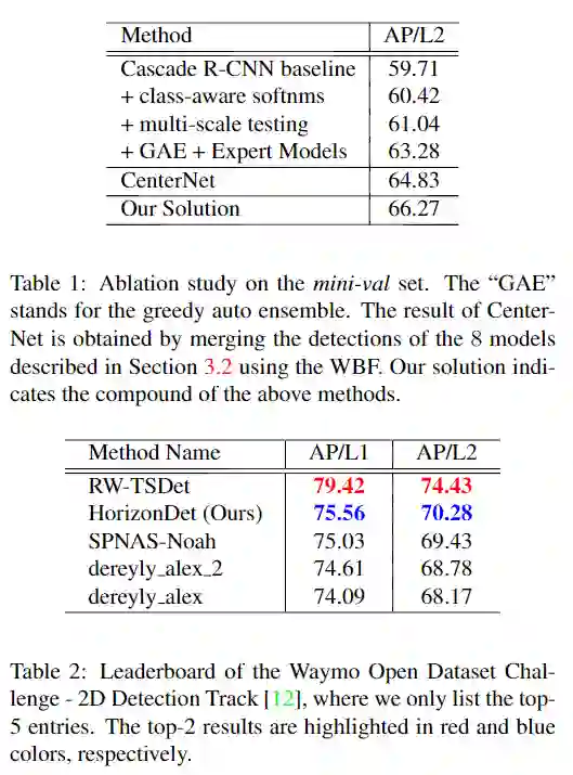 在自动驾驶系统中,通常需要对车辆和行人进行可靠、准确的检测。在本报告中,介绍了用于自动驾驶场景的最新2D目标检测系统。具体来说,首先,将流行的两阶段检测器和一阶段检测器以Anchor free的方式集成在一起,以产生可靠的检测结果。此外,训练了多个专家模型并设计了自动Ensemble方案的Greedy版本,该方案会自动合并来自不同模型的检测结果。值得注意的是,整体检测系统在Waymo开放数据集v1.2上达到了70.28 L2 mAP,在Waymo开放数据集挑战赛的2D检测赛道中排名第二。