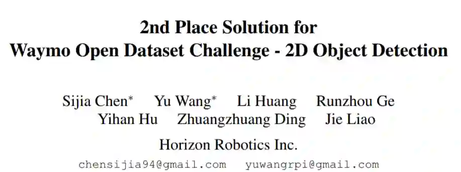 Waymo开放数据集挑战吸引了计算机视觉和自动驾驶领域的许多参与者。比赛中使用的Waymo Open Dataset提供了在真实自动驾驶场景中由多个LiDAR和摄像头传感器收集的高质量数据。在2D检测赛道中,在摄像机图像中采用2D边界框对车辆,行人和骑自行车者三类目标进行标注。在自动驾驶应用中准确而可靠地检测车辆、骑自行车的人和行人至关重要。为了实现这一目标,本文在这一挑战中开发了最先进的2D目标检测系统。