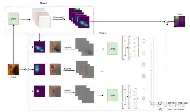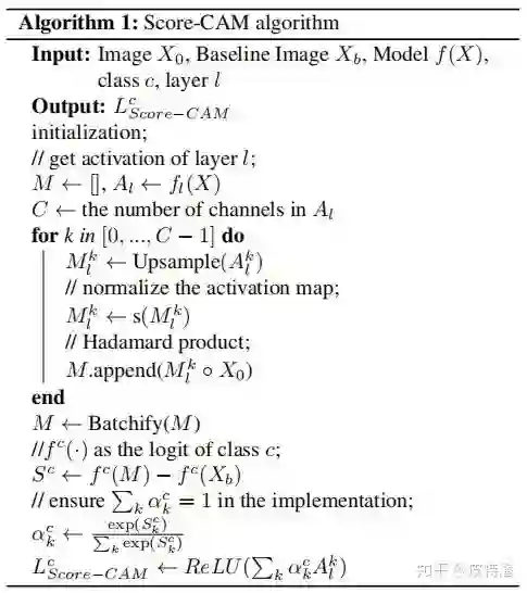 一句话概括就是遍历地将每层特征图置0后再进行网络前向获取目标类别得分, 该值与原始得分的相对大小作为特征图融合权重。论文实验表明, 该方法是优于grad-CAM的.