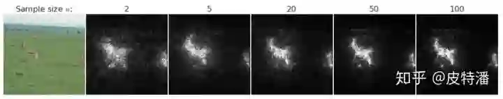n为对原图增加噪声并前向的次数, 为高斯噪声。可以看到,随着n的增加,噪声逐渐减少,saliency maps逐渐聚焦到目标物体区域。