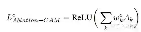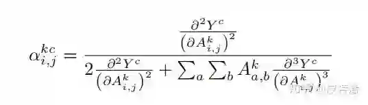 其中c为目标类别, k表示特征图第 k层(或者说第 k个channel), 为该层特征图上的元素位置。可以看出公式中用到了二阶偏导和三阶偏导,计算会更复杂。本文不做详细推导,具体可见论文。