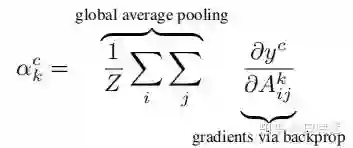 上文的局限性就是网络架构里必须有GAP层,但并不是所有模型都配GAP层的。而本文就是为克服该缺陷提出的,其基本思路是目标特征图的融合权重可以表达为梯度。另外,因为热图关心的是对分类有正面影响的特征,所以加上了relu以移除负值。其实并不一定要是分类问题,只要是可求导的激活函数,在其他问题也一样使用Grad-CAM。特征融合权重计算公式如下: