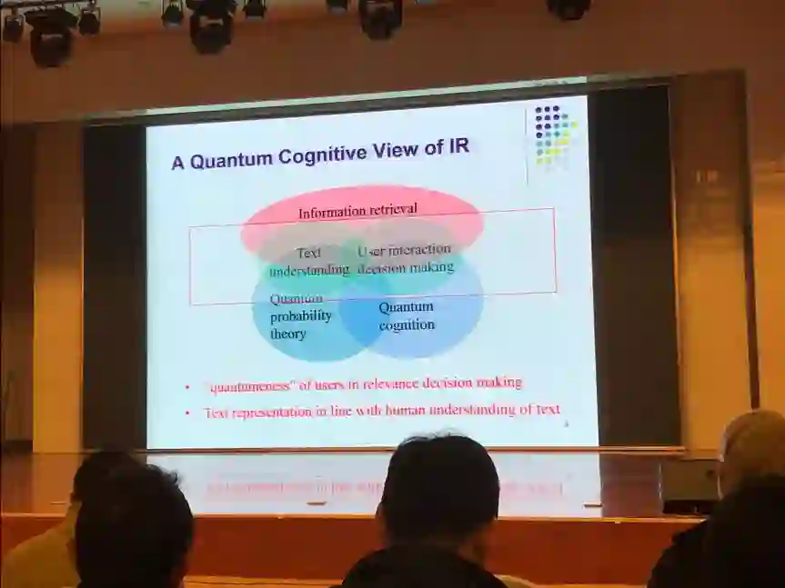 来自北理工的宋大为教授的报告则更为新颖的角度,其主题为《A quantum cognitive perspective for informationaccess and retrieval》,即量子认知,借用量子力学的方法和语言来进行认知、信息获取等的研究。值得一提的是,宋大为以及天津大学的张鹏也是目前国内少数几位将量子力学与NLP结合起来研究的学者。