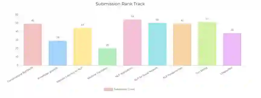 从中可以看出哪些研究方向更为热门。有意思的是,在NLP应用等领域论文投稿论文数量非常多,而像机器翻译、知识图谱等却相对较少。