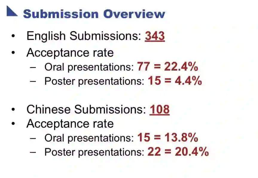 在451篇主会投稿中,接收长文(Full paper) 92篇,录用率为20.40%;