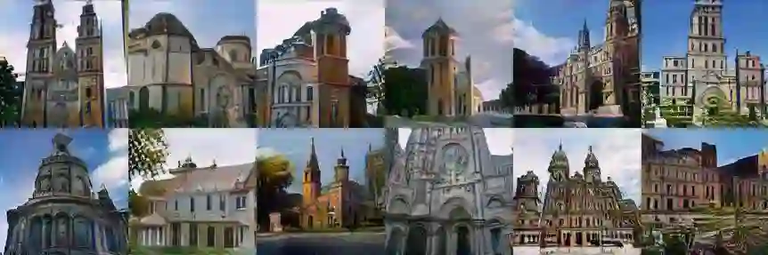 LSUNCHURCHOUTDOOR上训练,生成的256x256教堂图像