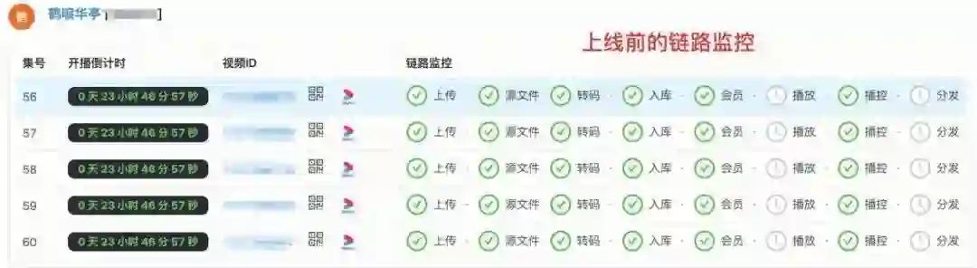 3)上线前 24 小时播报检测情况,比如在上线前的 12 小时、4 小时、1 小时播报当前检测 状态。这样不仅让各方知晓即将上线剧集,也了解各个业务的检查状况。