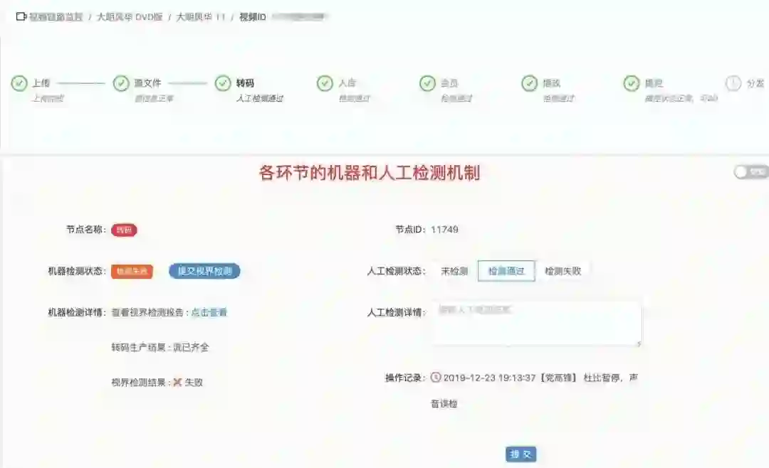转码完成的流会自动进入视频质量检测,检测其声音、画质、数据等;
