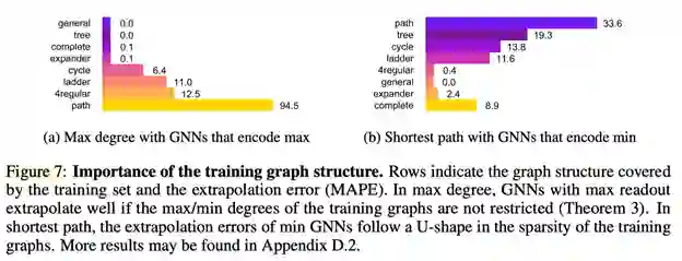 文章还发现不同的图的拓扑结构会影响不同任务的外推效果。在寻找最大节点任务中,对于没有节点度数限制的图表现的效果会更好。环、阶梯图、正则图、路径这种有度数限制的图会导致外推失败。在寻找最短路径任务中,过密或过于稀疏的图都会对外推造成影响。但是文章未对这些现象做出过多解释,需要对图的深入研究才能回答这些问题。