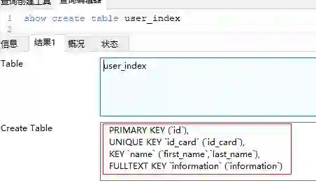 create TABLE user_index(id int auto_increment primary key,first_name varchar(16),last_name VARCHAR(16),id_card VARCHAR(18),information text);-- 更改表结构alter table user_index-- 创建一个first_name和last_name的复合索引,并命名为nameadd key name (first_name,last_name),-- 创建一个id_card的唯一索引,默认以字段名作为索引名add UNIQUE KEY (id_card),-- 鸡肋,全文索引不支持中文add FULLTEXT KEY (information);