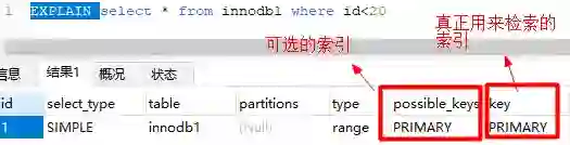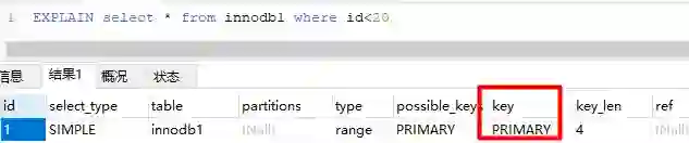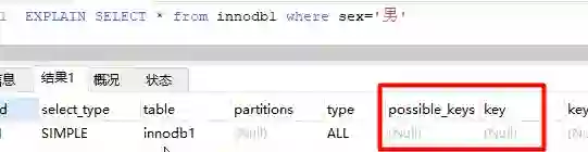 -- 增加一个没有建立索引的字段alter table innodb1 add sex char(1);-- 按sex检索时可选的索引为nullEXPLAIN SELECT * from innodb1 where sex='男';
