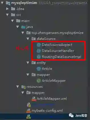 package top.zhenganwen.mysqloptimize.dataSource;import org.aspectj.lang.JoinPoint;import org.aspectj.lang.annotation.Aspect;import org.aspectj.lang.annotation.Before;import org.aspectj.lang.annotation.Pointcut;import org.springframework.context.annotation.EnableAspectJAutoProxy;import org.springframework.stereotype.Component;import java.util.List;import java.util.Set;import static top.zhenganwen.mysqloptimize.dataSource.RoutingDataSourceImpl.METHOD_TYPE_MAP;/*** DataSourceAspect class** 配置切面,根据方法前缀设置读、写数据源* 项目启动时会加载该bean,并按照配置的切面(哪些切入点、如何增强)确定动态代理逻辑* @author zhenganwen,blog:zhenganwen.top* @date 2018/12/29*///声明这是一个切面,这样Spring才会做相应的配置,否则只会当做简单的bean注入public class DataSourceAspect {/*** 配置切入点:DAO包下的所有类的所有方法*/("execution(* top.zhenganwen.mysqloptimize.mapper.*.*(..))")public void aspect() {}/*** 配置前置增强,对象是aspect()方法上配置的切入点*/("aspect()")public void before(JoinPoint point) {String className = point.getTarget().getClass().getName();String invokedMethod = point.getSignature().getName();System.out.println("对 "+className+"$"+invokedMethod+" 做了前置增强,确定了要使用的数据源类型");Set<String> dataSourceType = METHOD_TYPE_MAP.keySet();for (String type : dataSourceType) {List<String> prefixList = METHOD_TYPE_MAP.get(type);for (String prefix : prefixList) {if (invokedMethod.startsWith(prefix)) {DataSourceHandler.setDataSource(type);System.out.println("数据源为:"+type);return;}}}}}
