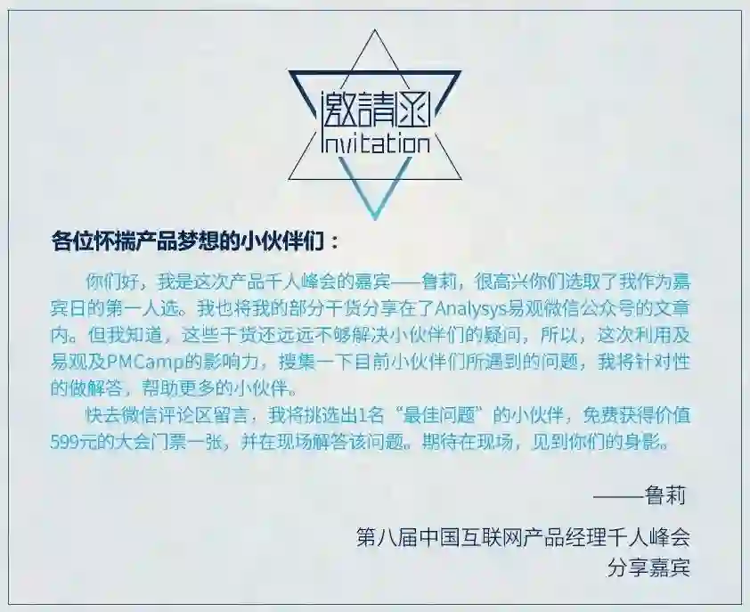如此干的干货分享,鲁莉笑称简直是被迫做了一次人生总结。6月30日的产品经理千人峰会现场分享,她还将拿出压箱底产品秘笈与您分享,让我们拭目以待。