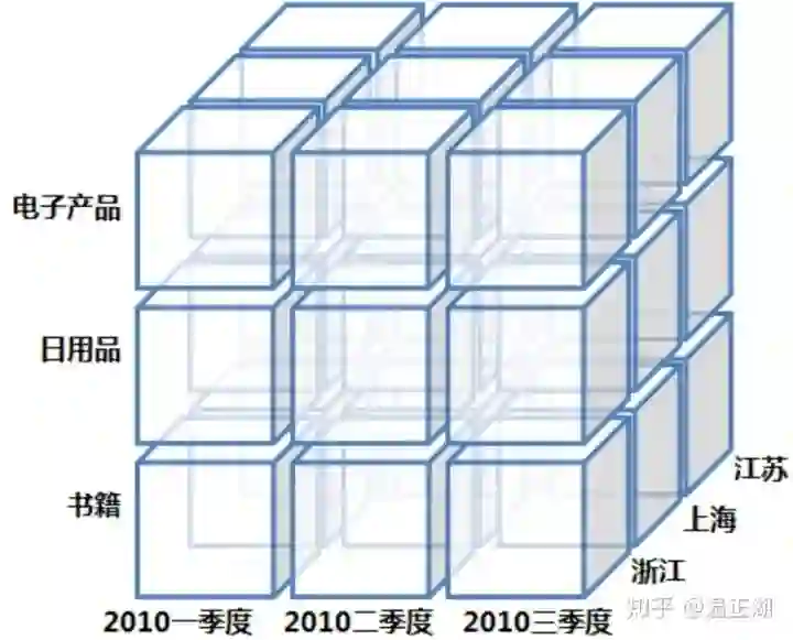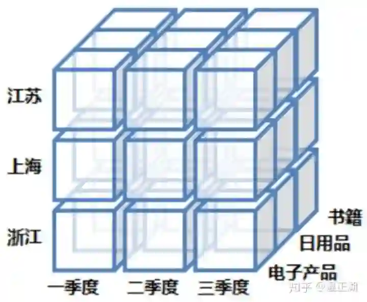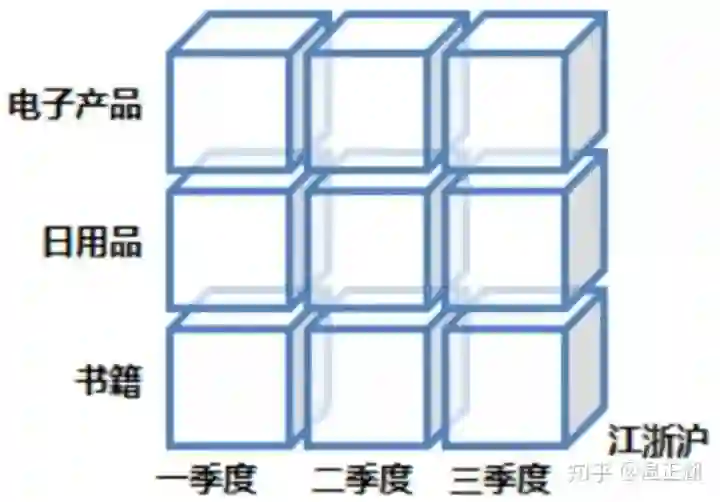 上图来源于参考资料,比较好展示了多维模型,从大立方体上可以看到商品类型、季度和地区三个维度。但对于每个维度又是一个小立方体,比如第一季度浙江的书籍销售情况就是左下角的小立方体。在这个小立方体中,根据需要,我们还可以按照书籍类型,从季度拆分为月度,浙江拆出各地级市。