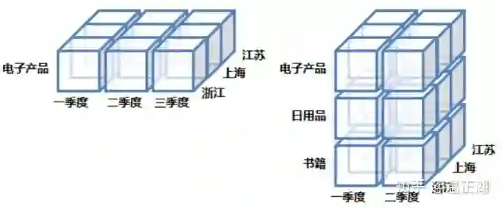 基于数据模型及操作又可以引入数据立方体概念及对其的常见操作。