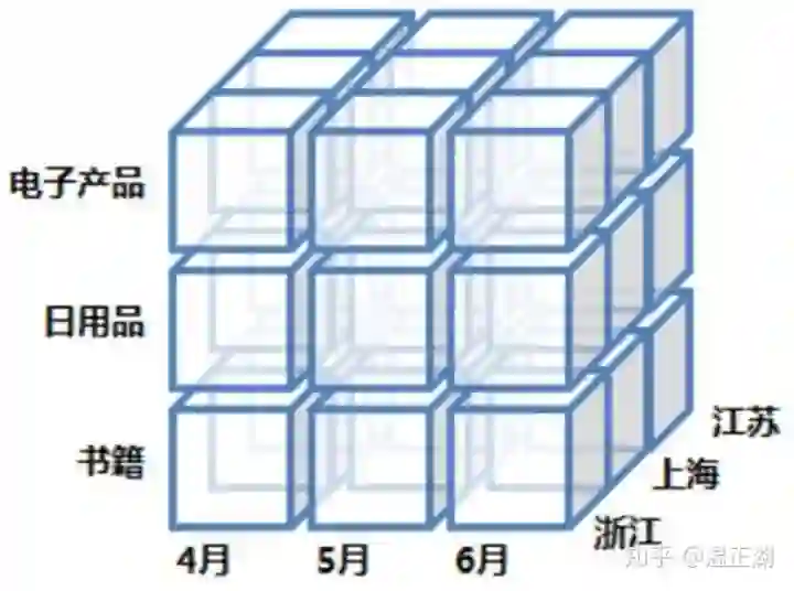 与上面几种操作不同,旋转并未减少或增加要分析的样本。而是根据不同的目的,改变了分析的角度,比如本来将产品作为观察角度,将地域和时间作为参照,分析不同产品在销售情况。通过旋转,转而分析江浙沪三个不同地区的产品销售情况。