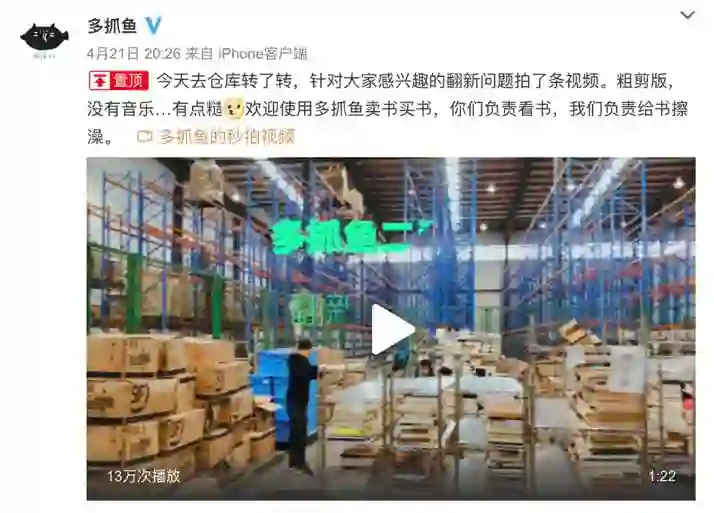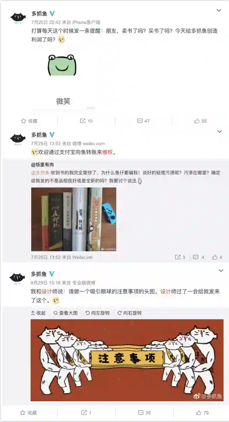 多抓鱼在2018年8月17日的微信文章中,将收购旧书遇到过的种种有关正盗版的问题,通过《解忧杂货店》《社会心理学》等热门图书的比对案例,告诉读者如何鉴别正盗版图书,并进一步解释了为什么平台收到新书也要拆封检验,以及为什么二次人工审核后才能打款等用户最关注的问题。
