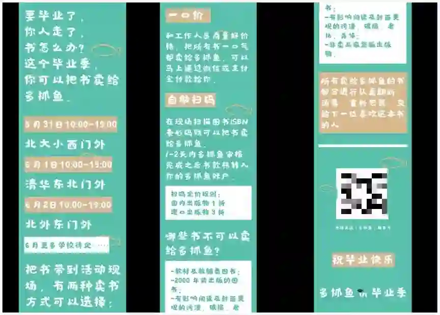 毕业处理图书是二手书循环的一个重要场景,大学生手中那些非教材类优质图书也是平台急需的。多抓鱼上线时,恰逢毕业季,所以他们在线下举办了“多抓鱼in毕业季”活动,2017.5.31-6.2连续三天在北大、清华、北外现场收书。