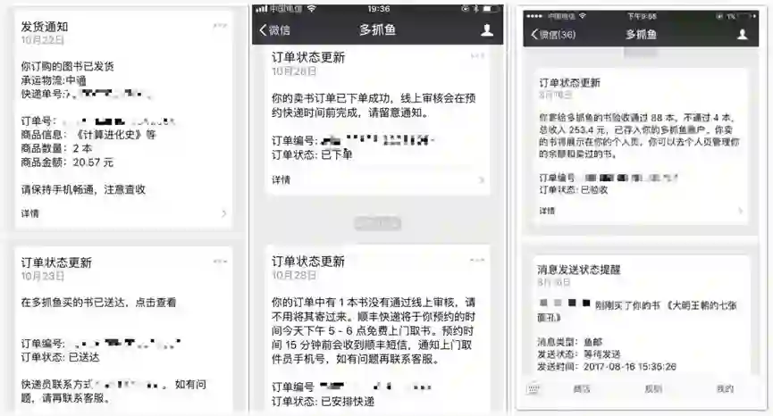 除了到货提醒,包括卖书的订单审核、收书后的费用到账、卖书发货和签收,整个流程都会及时追踪并通过微信推给用户,这种及时传递信息有利于维护用户粘性,召回不活跃用户