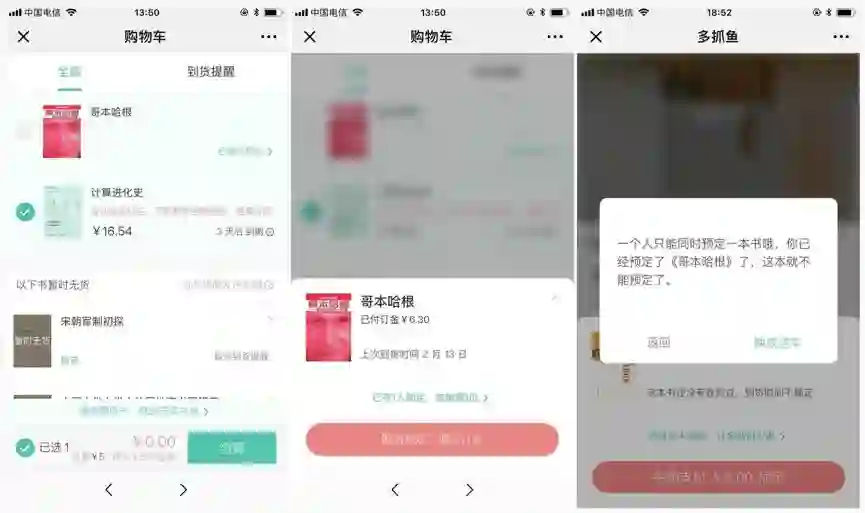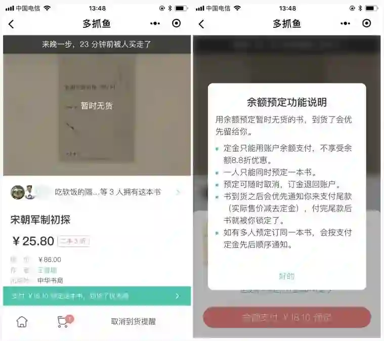规则只允许一个人同一时段预定一本书,待该本成功购买7天后才能预定下一本,既避免了有的用户囤积居奇影响他人购书,又保证预定的人是真心实意想买,促进了下单转化率;“预定”只能用卖书所得的账户余额而不支持直接充值,能鼓励更多人卖书给平台,将买卖的闭环顺利建立起来。