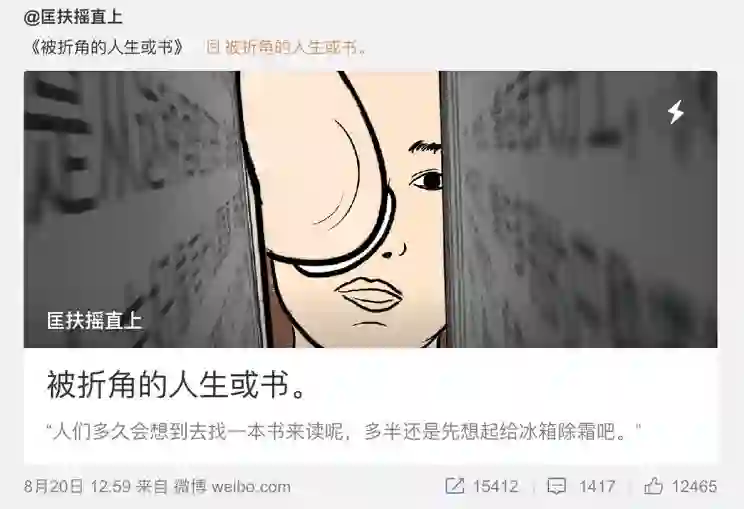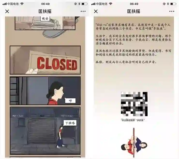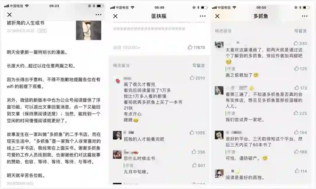 2018年8月20日,匡扶摇长漫画《被折角的人生或书》围绕着一家叫“多抓鱼”的二手书店发生的故事,在微博和朋友圈双刷屏。