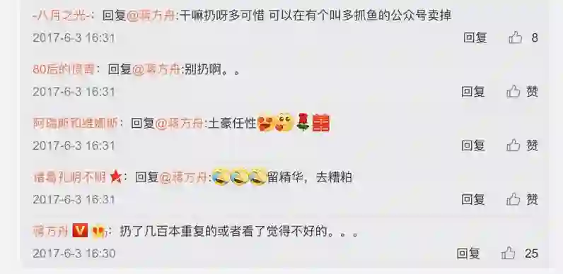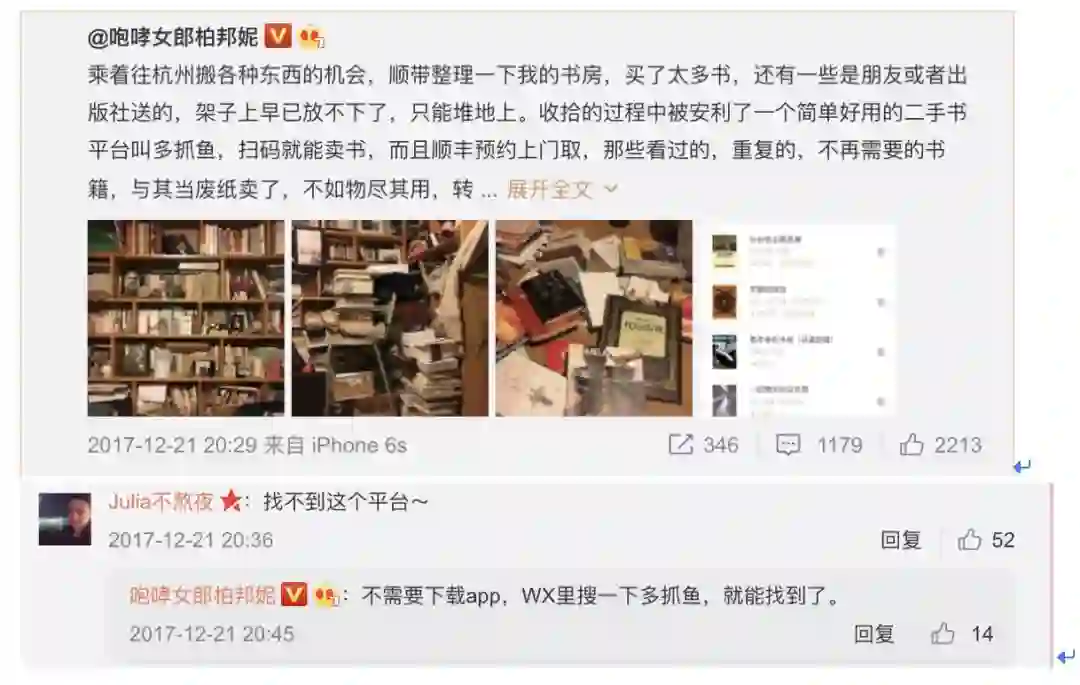 8月20日当天,紧随匡扶摇漫画的刷屏,拥有21万粉丝的大V麻宁在微博长文章中,借着“消费降级”的话题,提到了二手循环书店“多抓鱼”。