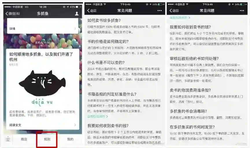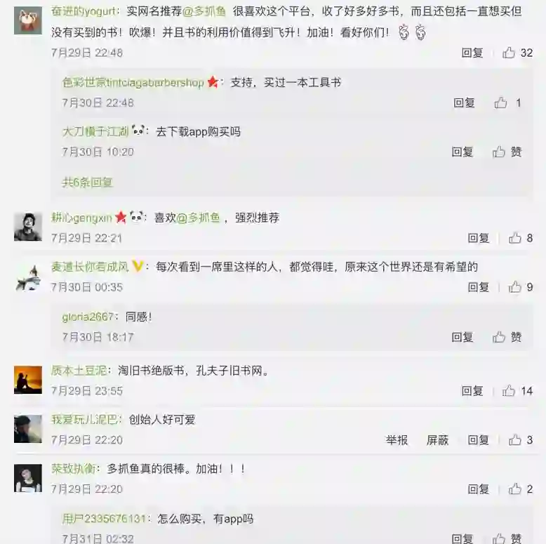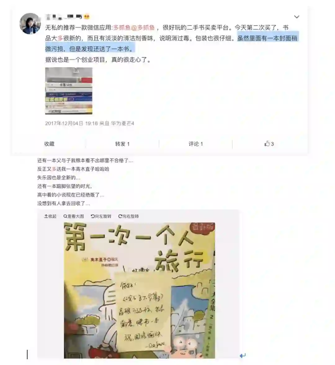 8月12日36氪转发了“超人测评”的文章《上线一周年超30万用户,“多抓鱼”二手书交易到底体验怎么样》,对比了C2B2C模式下多抓鱼、漫游鲸、转转二手书买卖的体验报告——多抓鱼以收书标准严格、二手书质量最佳荣登卖书买书体验Top1。