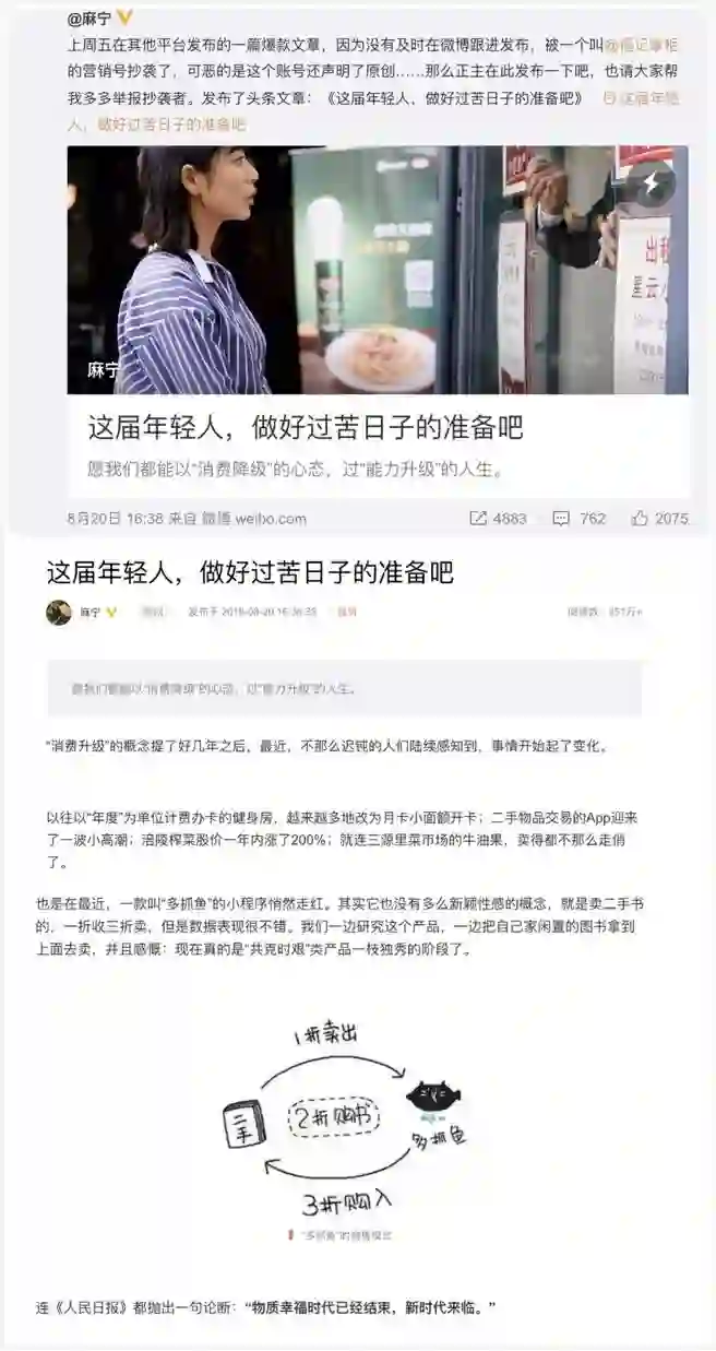 这篇文章最早于8.16日发表在微信平台上,因为紧贴热点“消费降级”,两天阅读量超过40万,虽然19日因为未知原因被删除,但20号整理成长文章发布在微博后又有251万阅读、4883转发、762评论、2075点赞。