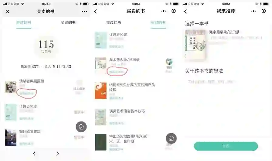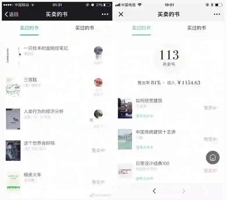 b.从买卖书的动态中追踪图书流转,用户可以看到自己手中的书是哪里来的,自己卖出去的书又到了谁手里(下左图),还有买卖统计来展示用户在平台的收益和售出率(下右图)。