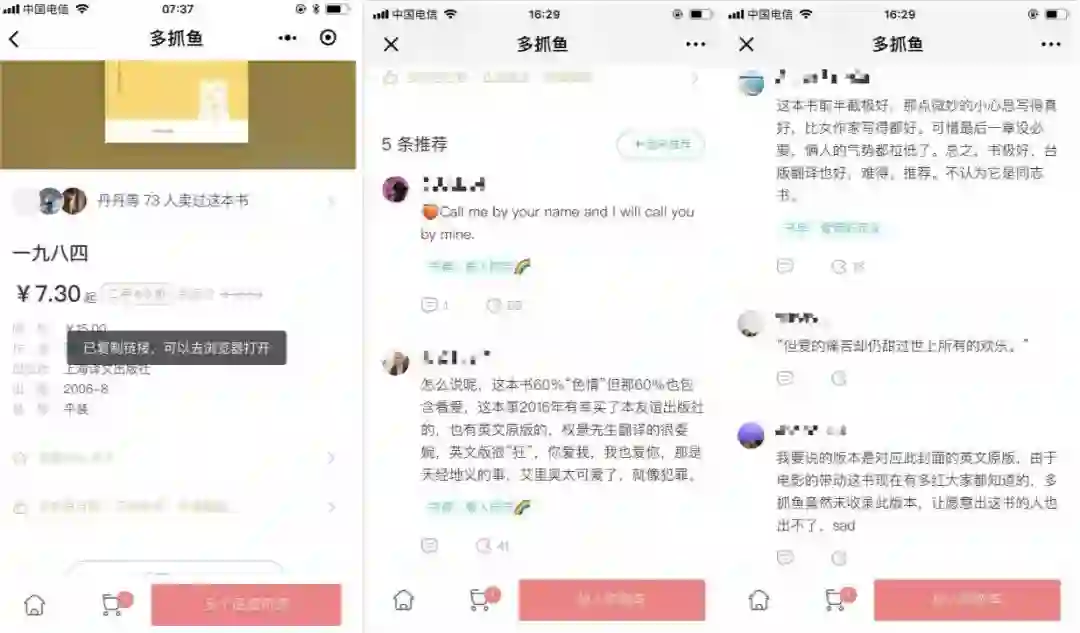 这样随着书评越来越多,多抓鱼就会成为一个可以卖书的豆瓣读书(如下图),用户可以直接使用平台上的书评作为下单参考,不用每次都跳转到豆瓣相关页面。
