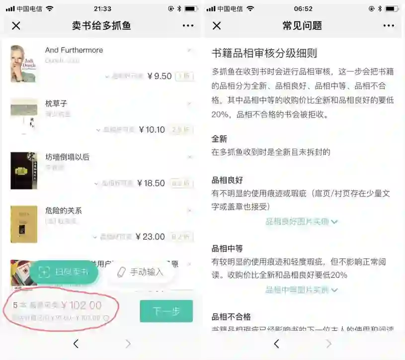 随后,收书价格又根据品相差异有了区分。用户扫码得到的是默认品相良好的价格,实际收到的书款会因品相好坏而有所差异。