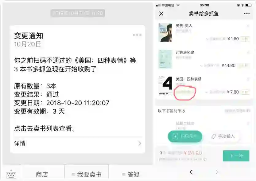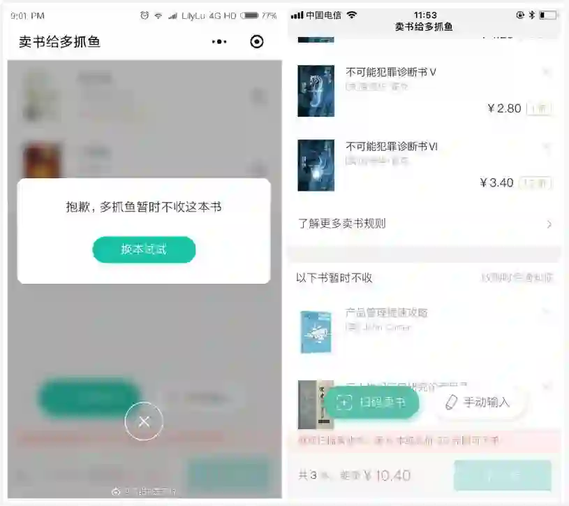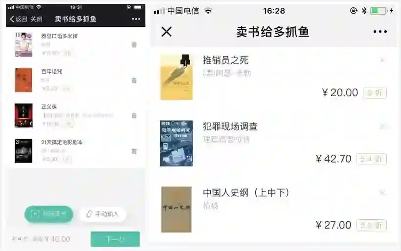 2018年7月初,随着大数据的积累,多抓鱼的收书价格由简单的“1折,2折,3折”开始变得更精确、多元(下右图),对于特别稀缺的图书,收购价格甚至高于原价。