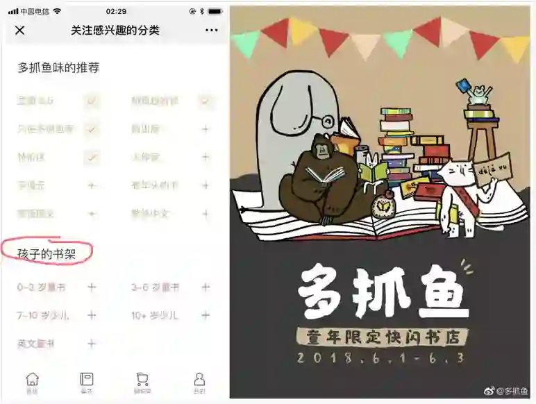 2018年6月初,多抓鱼借着儿童节,拓宽了童书的收购范围,专门为童书和绘本上线了“孩子的书架”专区(下左图),并且在朝阳大悦城举办了为期3天的“童年限定快闪书店”以配合宣传。