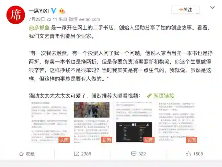 多抓鱼促进优质图书循环的愿景与一席倡导的人文关怀相契合,猫助对创业过程轻松诙谐叙述也有别于那些打了鸡血改变世界的陈词滥调,所以这篇演讲的文字版7月27日发布到微信后就在朋友圈刷屏,29号微博转发又加了一把火: